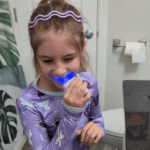 Le secret? Une technologie LED bleue, un design coloré qui ressemble à un jouet – mais qui fonctionne comme un véritable outil dentaire professionnel.